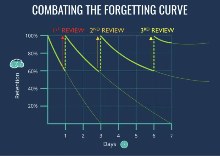 The best way to combat the forgetting curve is to interrupt the process by revisiting the material at specific time intervals just as you’re about to forget it – a technique called spaced repetition. The great thing about spaced repetition is that after every review session, the brain retains the new information a little bit better, and the rate of forgetting gets slower. This allows us to gradually increase the length of time between review sessions and commit what we learn to long term memory.